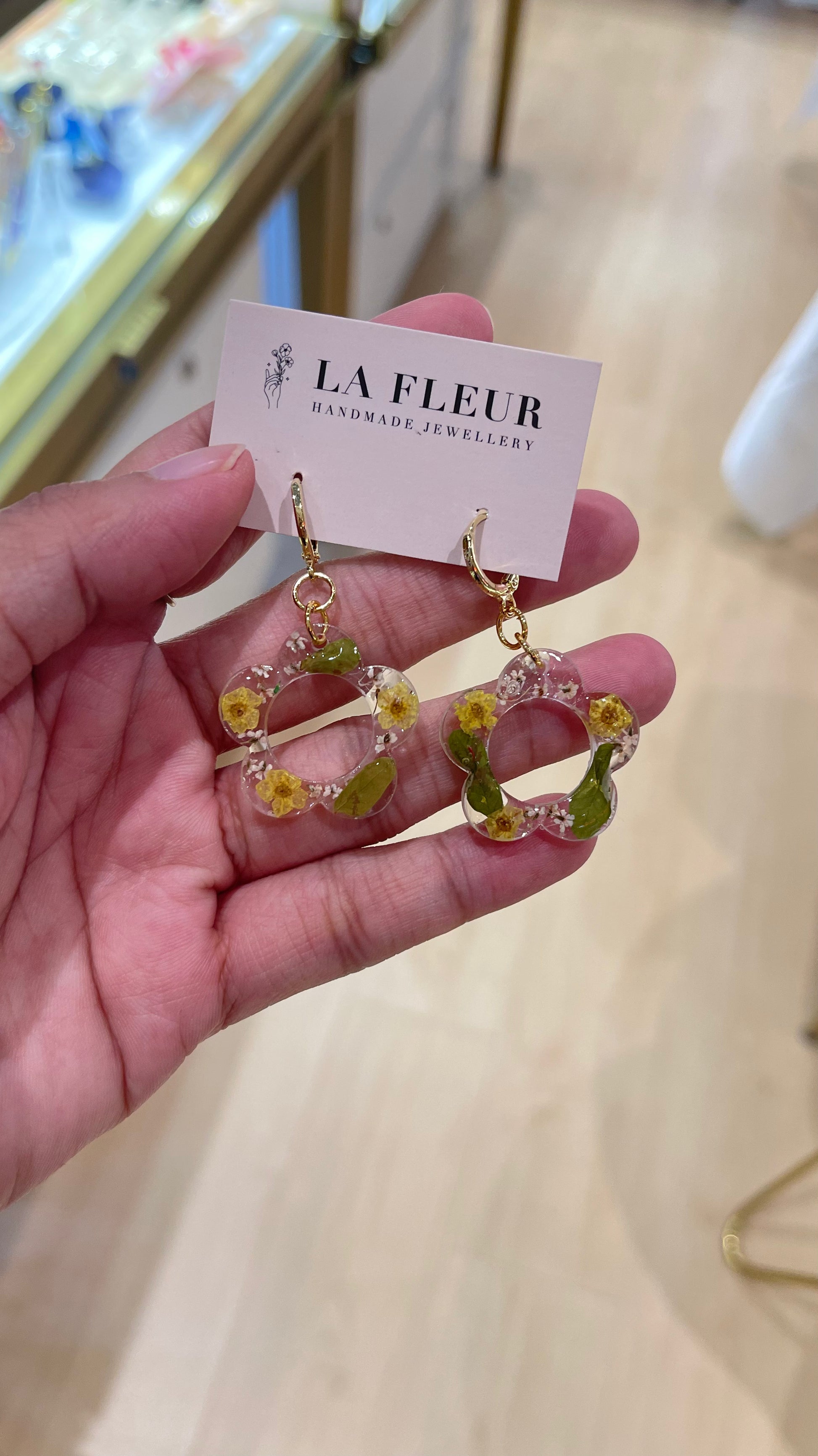 Handmade resin jewelry with real flower petals.